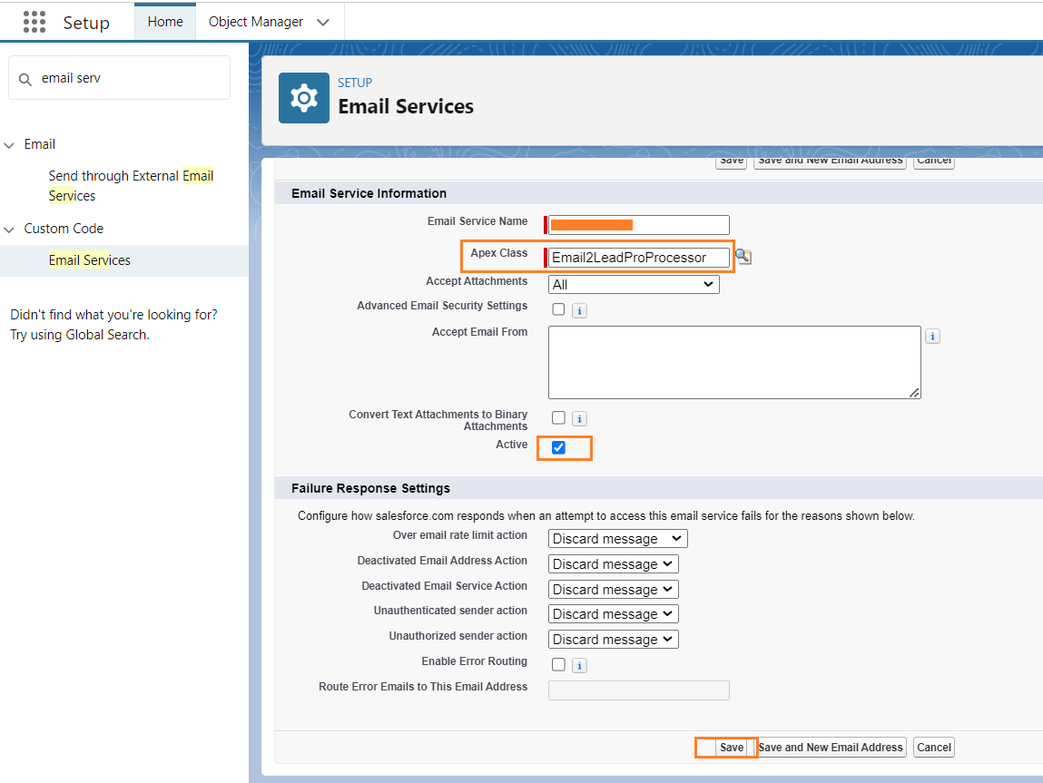 And select the “Email Service” associated with “Email2LeadProProcessor”