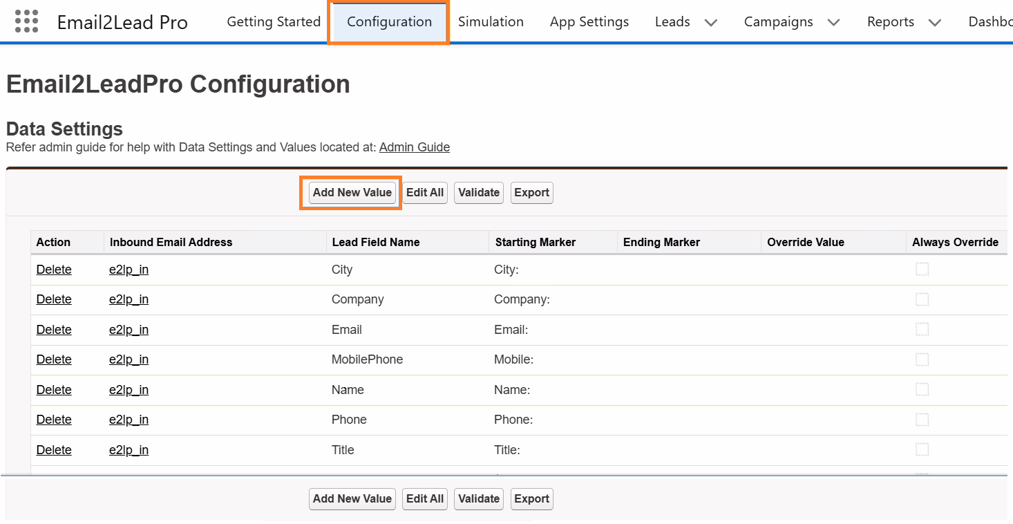 To add parsed/extracted data from an email into the lead we must first map that email data to a Lead field (default or custom). This is done by creating a record in the data setting. To create a new mapping (data setting record), click on the ‘Add New Value’ button.